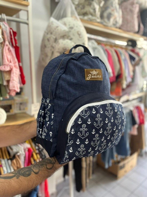Combiná practicidad y estilo con esta mochila maternal diseñada para acompañarte en todas tus salidas. Confeccionada en tela de jean resistente, destaca por su diseño náutico con estampa de anclas y detalles en ecocuero.