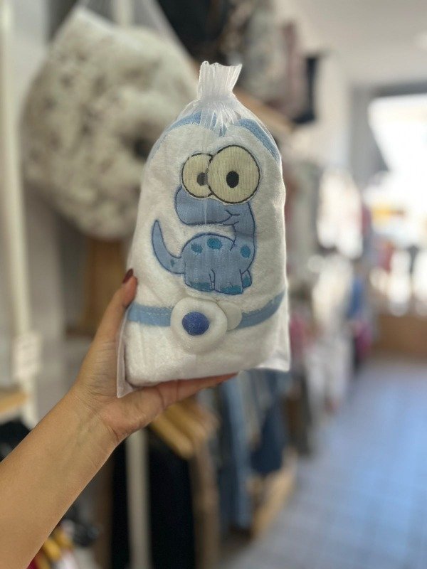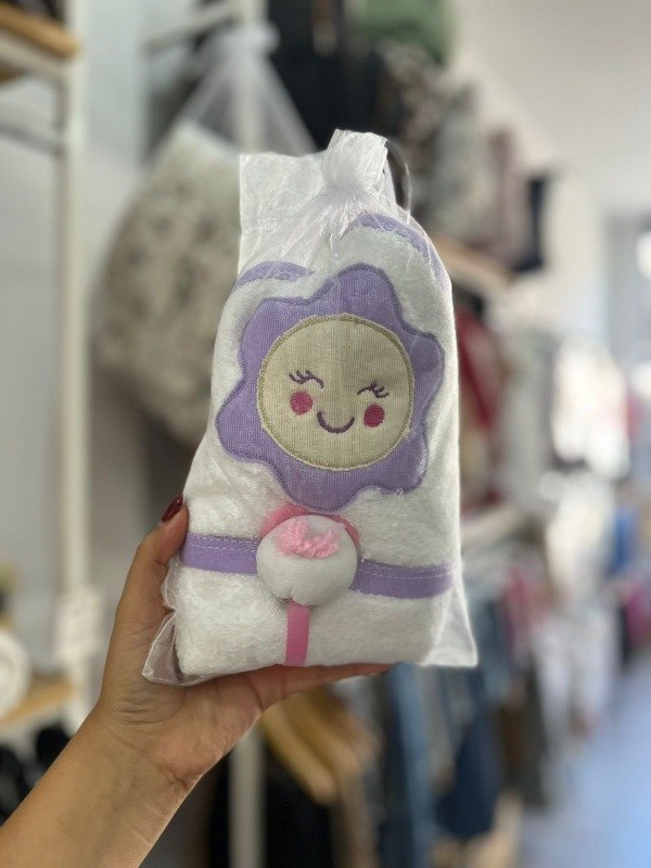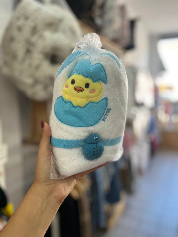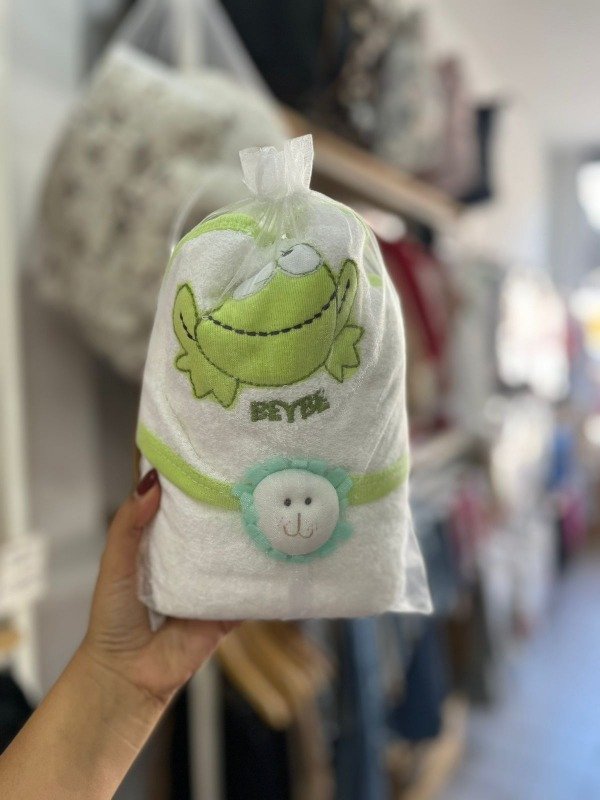 Suave y práctico toallón con capucha y portachupete, ideal para envolver y secar a tu bebé después del baño. Está confeccionado con tela absorbente y delicada con la piel, brindando abrigo y comodidad. Viene presentado en una bolsita, perfecto para regalar o para mantenerlo protegido. 80 cm x 90 cm.