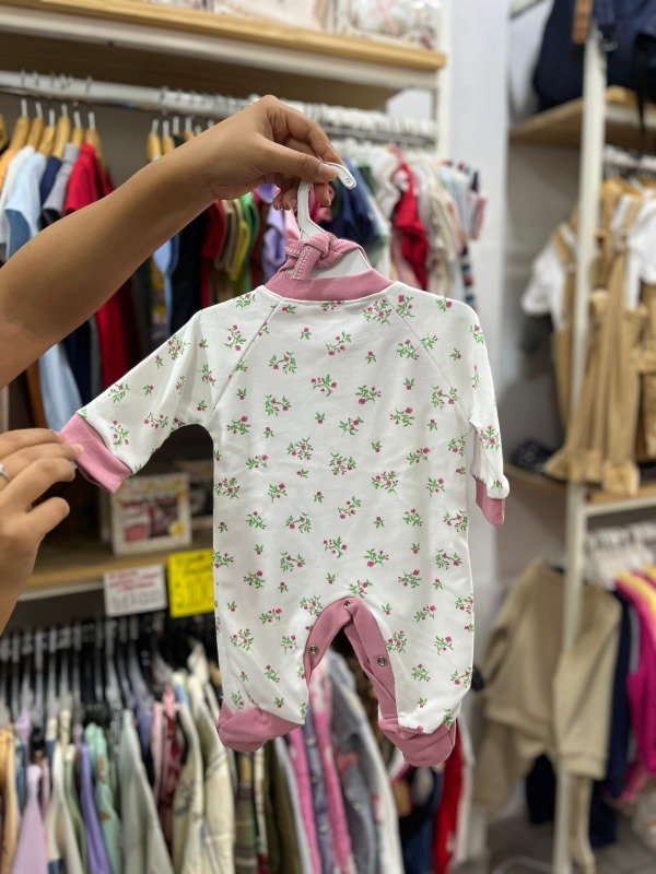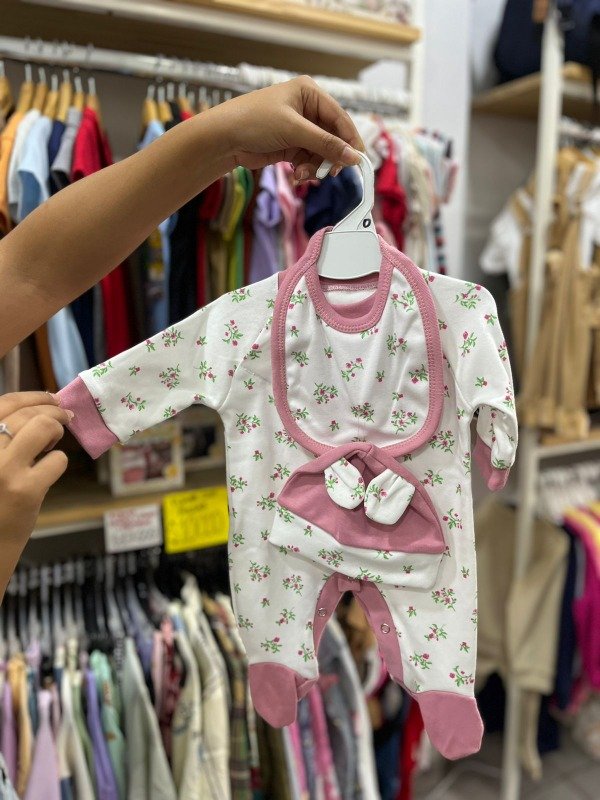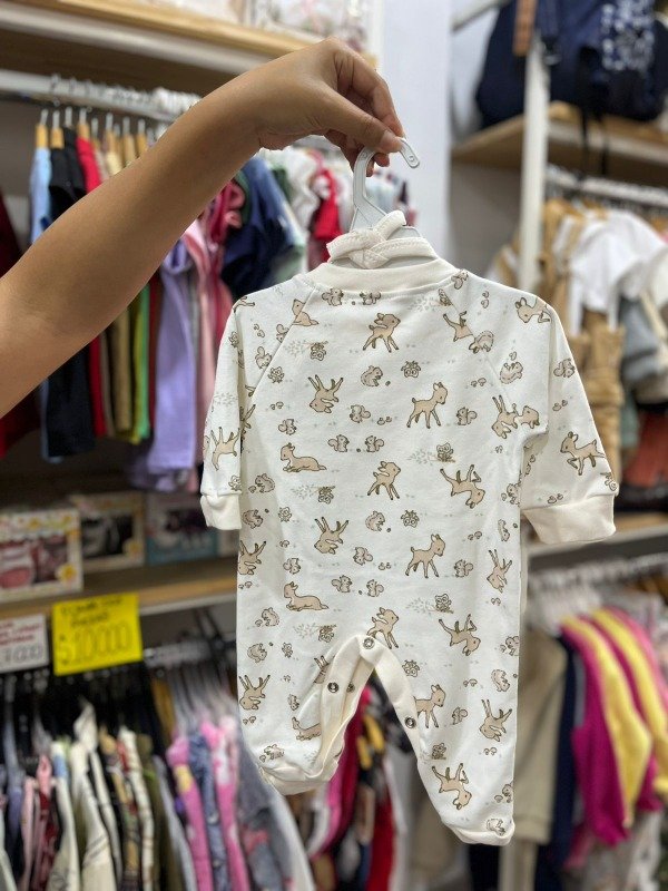Incluye enterito con pie y broches para un cambio fácil, babero a juego y gorrito con orejitas para mayor abrigo.